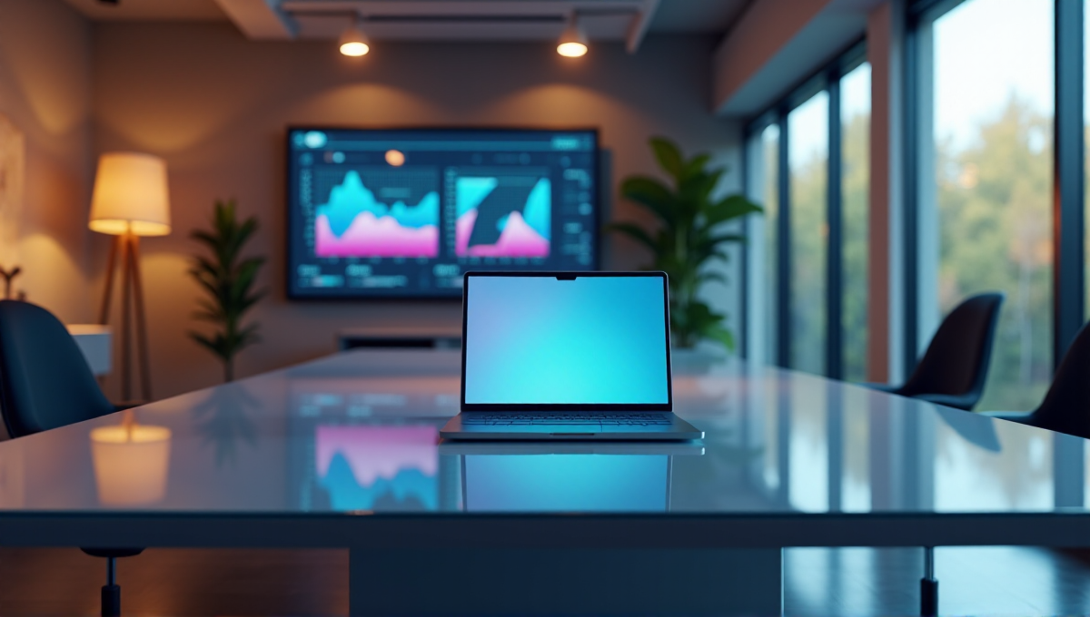 "A modern office space with a sleek glass desk featuring an AI-driven laptop and smartboard displaying productivity metrics in warm golden hour lighting."