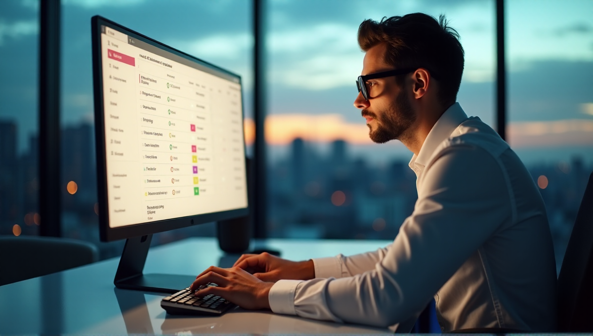 "A modern office worker sits at a minimalist desk with an AI-powered task management interface on their computer monitor, using trendy glasses and crisp attire amidst a cityscape backdrop."