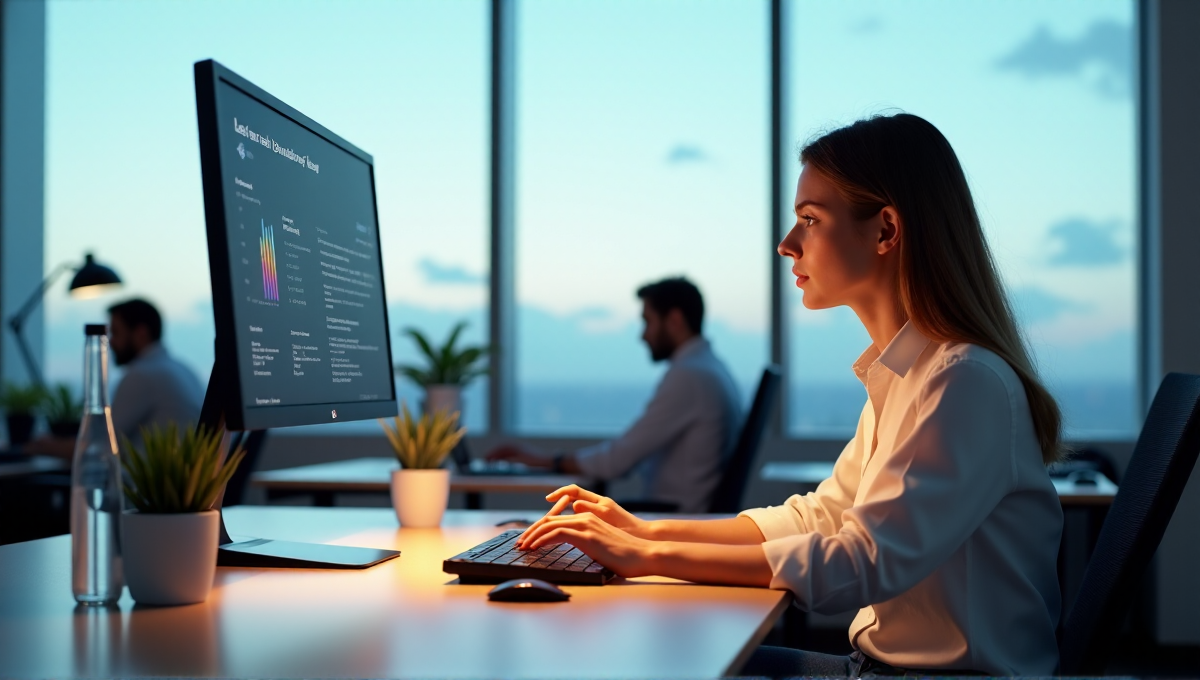 "A young professional sits at a minimalist desk, focused on an AI-driven task management interface on their 4K monitor, surrounded by a clutter-free workspace with plants and natural light."