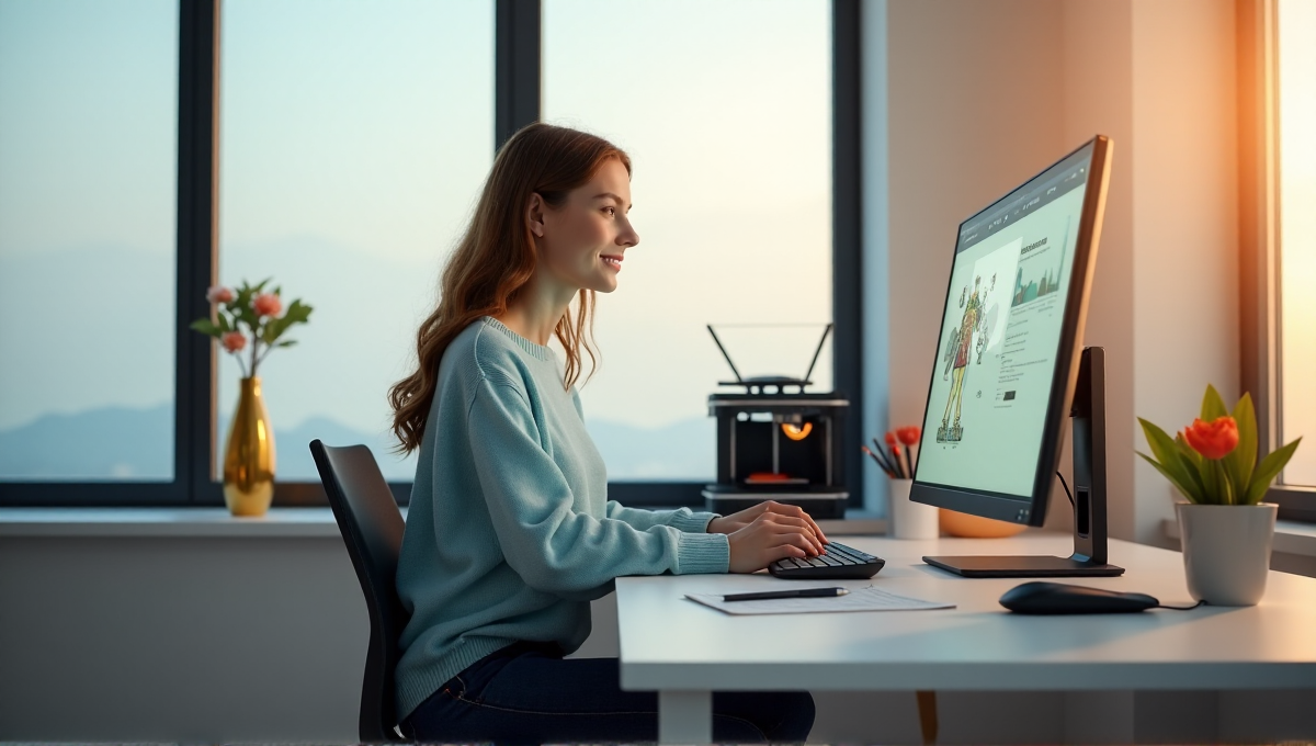 "A young woman sits at a minimalist desk with a computer monitor displaying an AI-powered hobby development platform, surrounded by creative tools in a well-lit room with soft natural light."