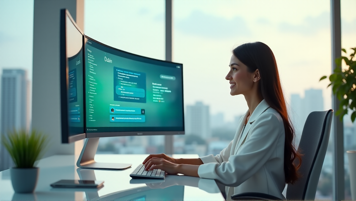 "A person sits at a minimalist desk in a modern office space, surrounded by calming pastel colors, with a large monitor displaying an AI-powered task management interface."