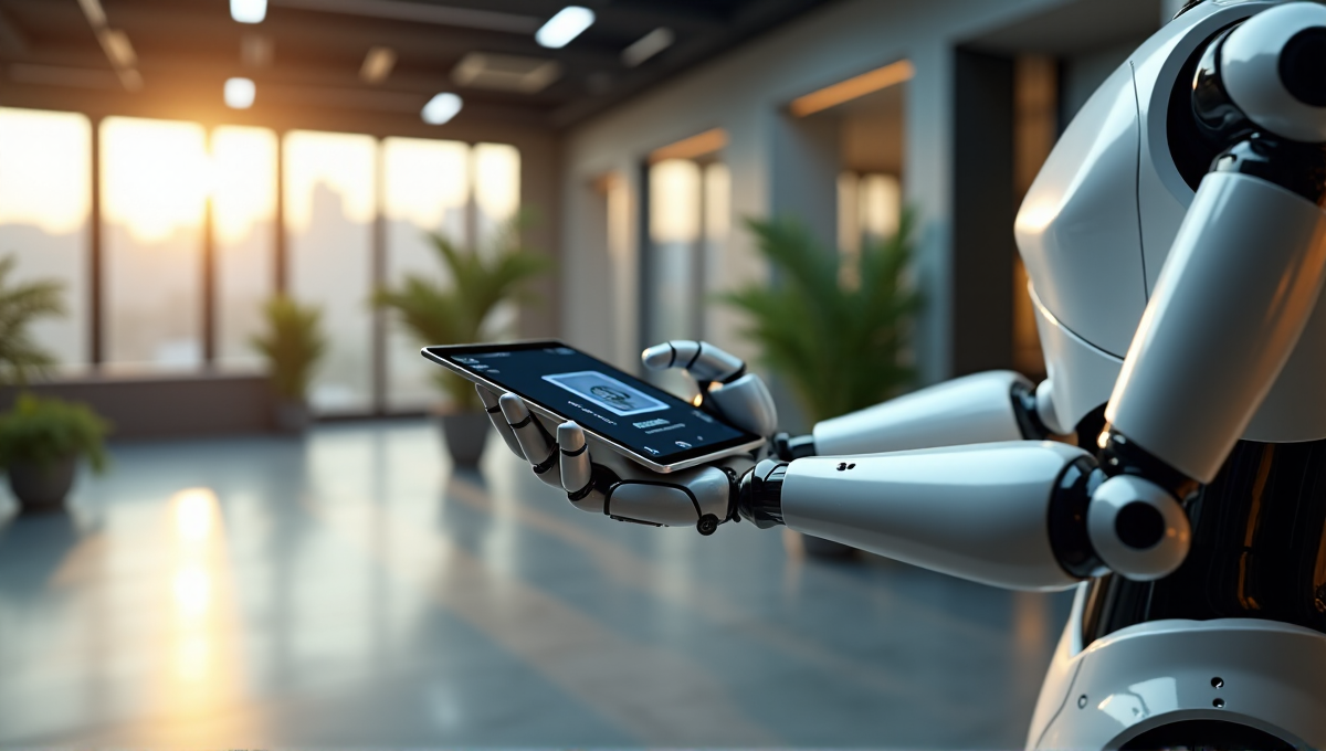 "A futuristic customer service center featuring a sleek robotic arm holding a tablet with an AI-driven interface in a minimalist workspace."