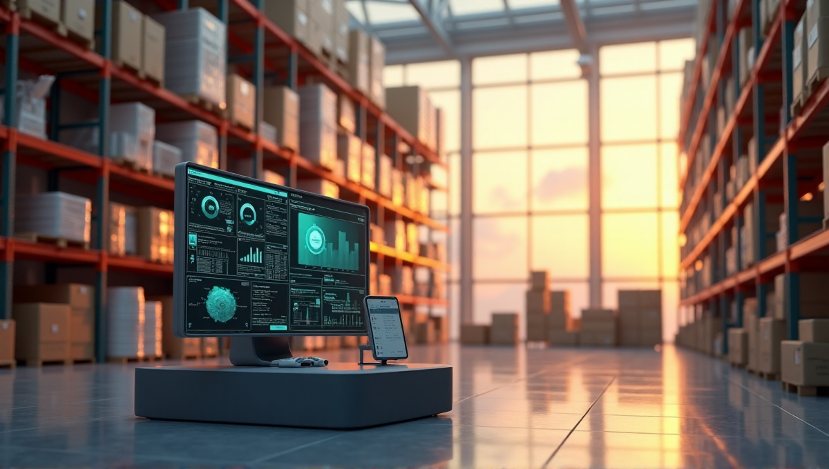 "A modern warehouse scene featuring a sleek inventory management system powered by AI automation solutions, surrounded by high-tech gadgets and devices."