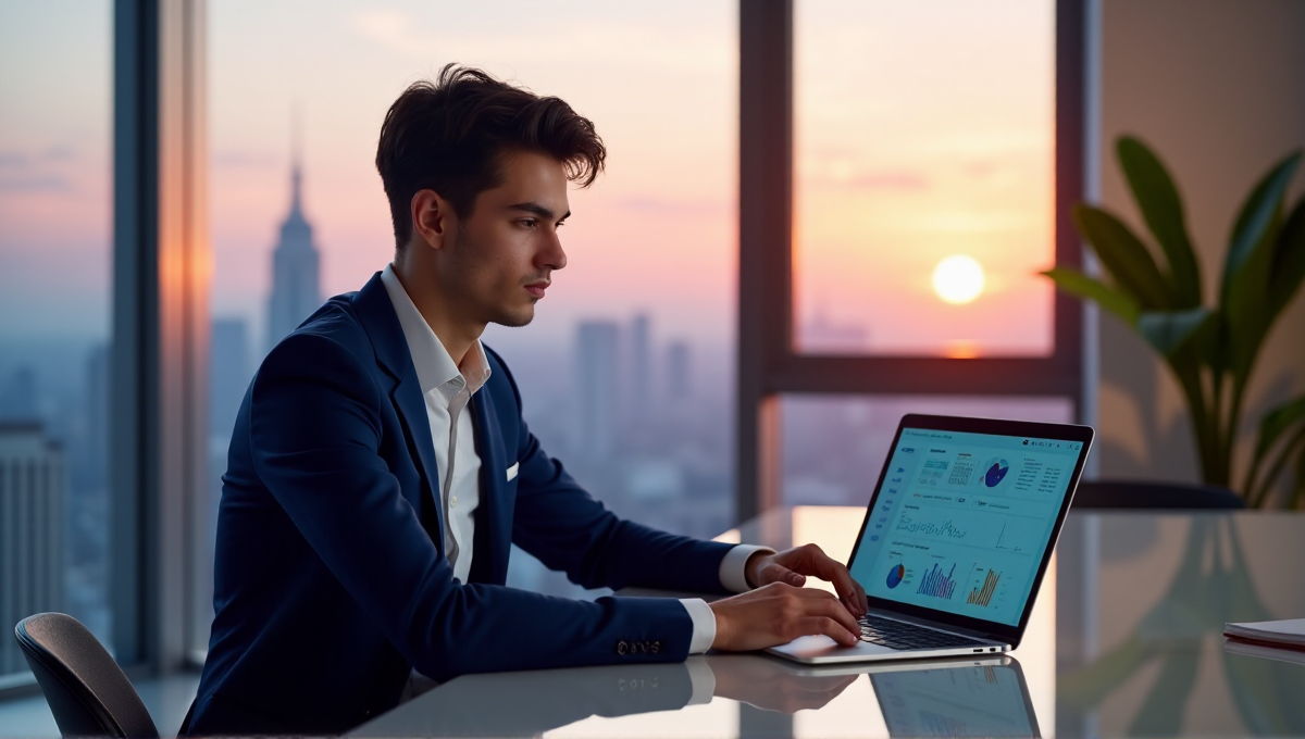 "A young professional sits confidently at a glass-topped desk with an AI-powered laptop displaying productivity metrics and efficiency tools, set against a serene cityscape backdrop."